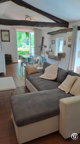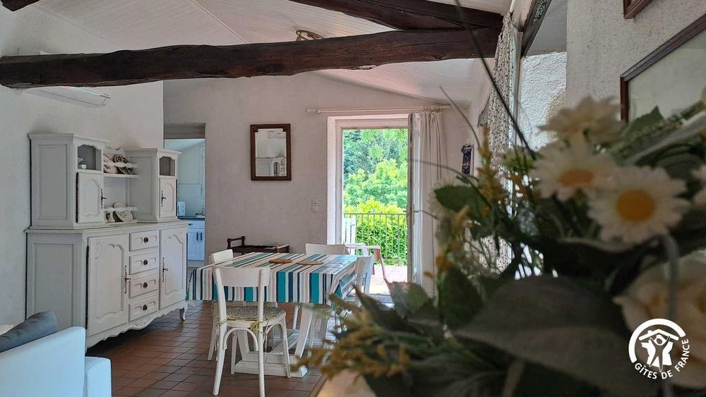 Le gîte est aménagé dans une maison en pierre typique du hameau. On y accède par quelques marches qui mènent à une terrasse équipée pour les repas en plein air. L'intérieur, de plain-pied, est organisé autour d'une pièce de vie chaleureuse avec coin salon, TV connectée, salle à manger et poêle à bois pour les soirées fraîches. Une cuisine indépendante bien équipée, une salle d'eau et des WC complètent cet espace.
